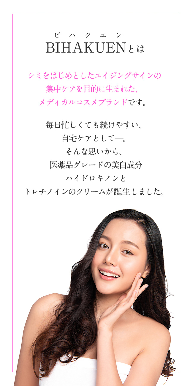 “美白の救世主&肌の漂白剤”ともいわれるハイドロキノン。“肌のターンオーバーを促進”するトレチノイン。『漂白』と『促進』の相乗効果で、あなたのお肌を生まれ変わらせます。